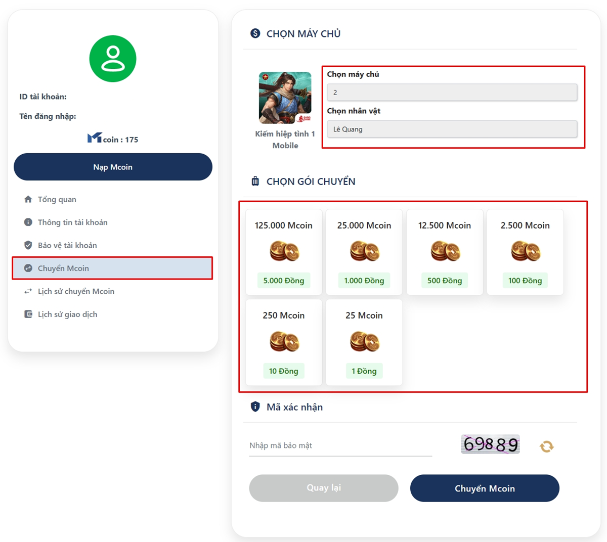 Sau khi chuyển thành công, Mcoin sẽ được cộng trực tiếp vào nhân vật trong game.