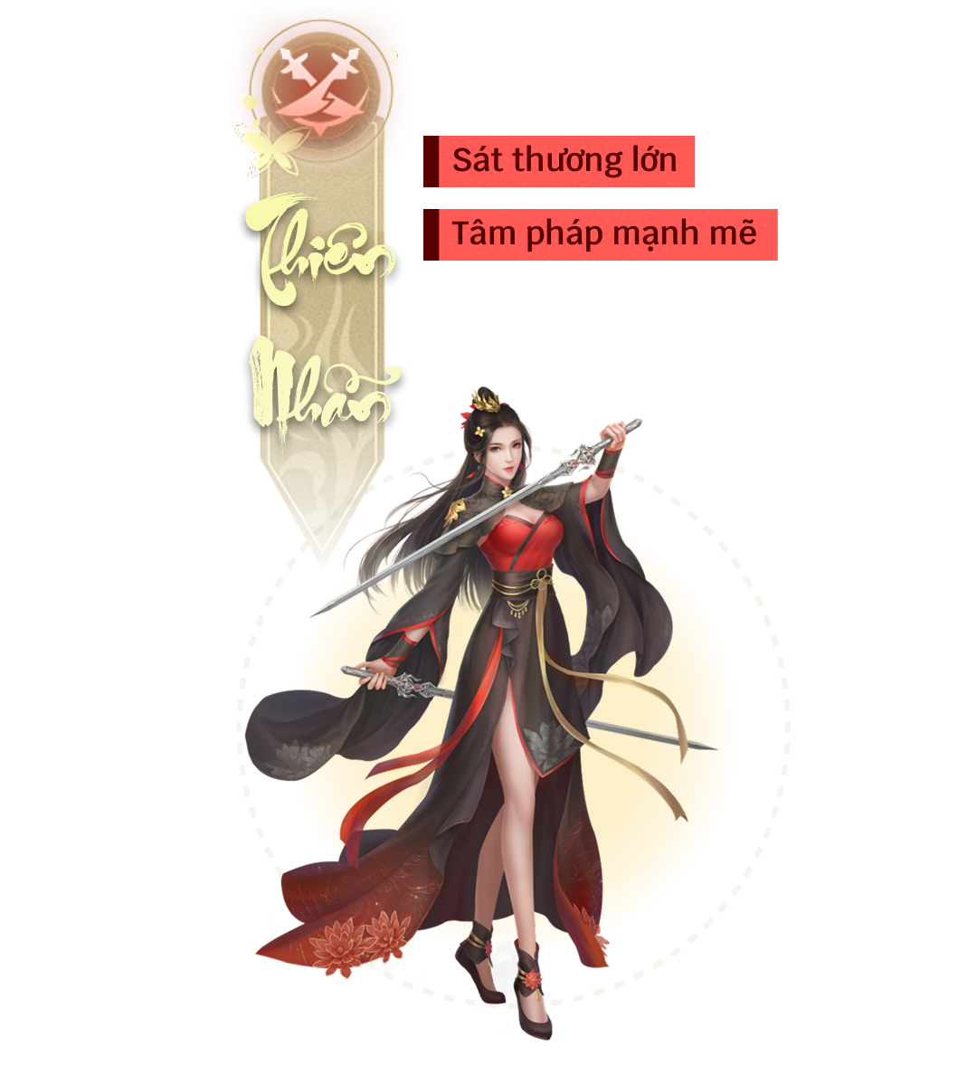 Thiên Nhẫn cao cấp mâu pháp, sử dụng trường thương tấn công liên tục các mục tiêu phía trước mặt và chuyển hoá một phần sát thương thành sinh lực & nội lực bản thân.